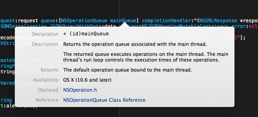 Command click on method names and class names to quickly navigate to implementations. Double click to open in a separate window. Swipe on a touch pad to go forward and back. Hold down on the back button to view the navigation history.Press option instead of command to read inline documentation of classes and methods.